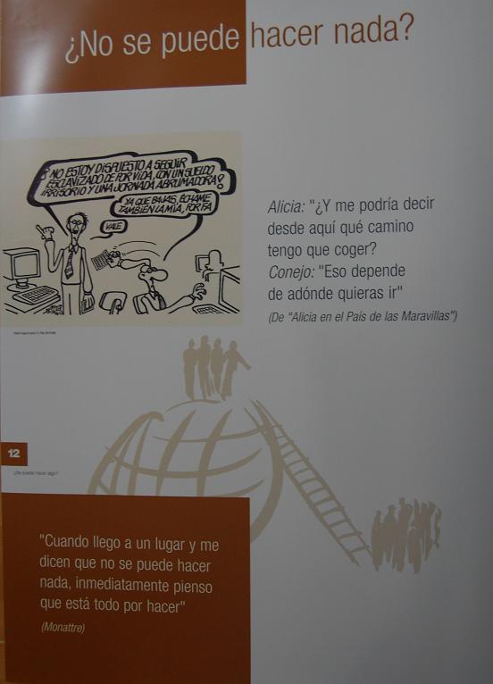 Descripción: Cartel con fondo blanco; en la parte superior izquierda un rectángulo marrón, debajo una viñeta de Forges a la izquierda y leyenda a la derecha, mas abajo, el globo terráqueo con la silueta de gente encima, unas escaleras y silueta de gente abajo, en la parte inferior un rectángulo marrón con leyenda escrita en blanco.