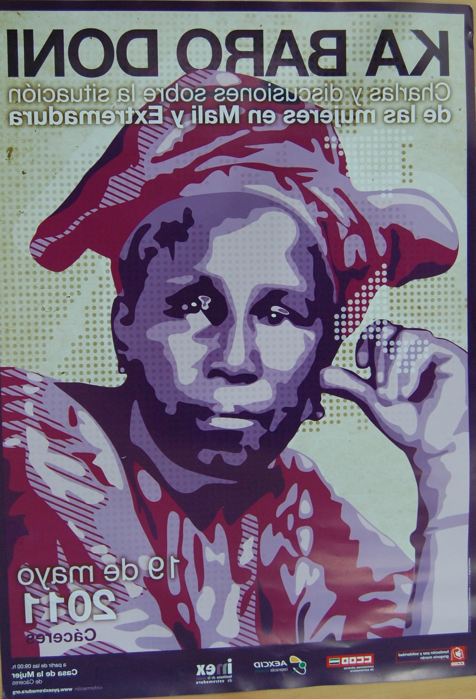Descripción: El fondo del cartel es de topos en colores suaves, el dibujo grande de una mujer africana en varios colores (rojo, morado..) llena el cartel.