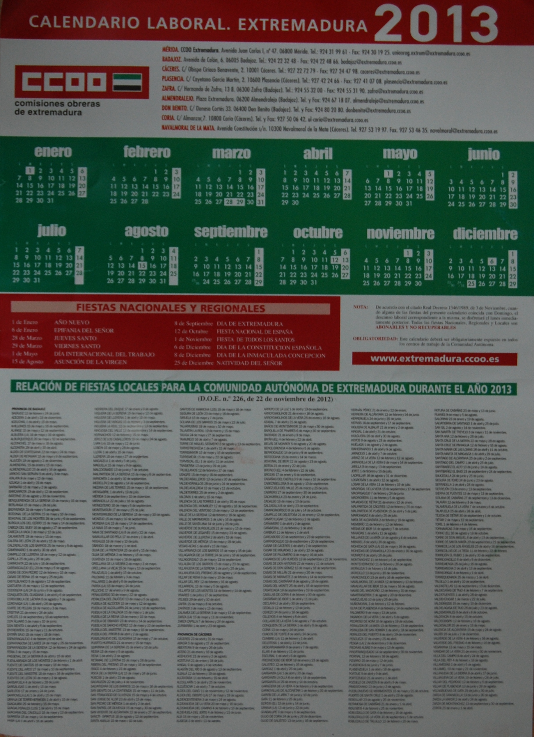 Descripción: El fondo del calendario es blanco, en la parte superior una franja roja y leyenda, mas a abajo las siglas de Comisiones Obreras de Extremadura y a la derecha en letras pequeñas la dirección de las distintas sedes de Extremadura, después un rectángulo verde y el calendario en su interior, en la mitad inferior; una relación de las fiestas locales para la Comunidad Autónoma de Extremadura.