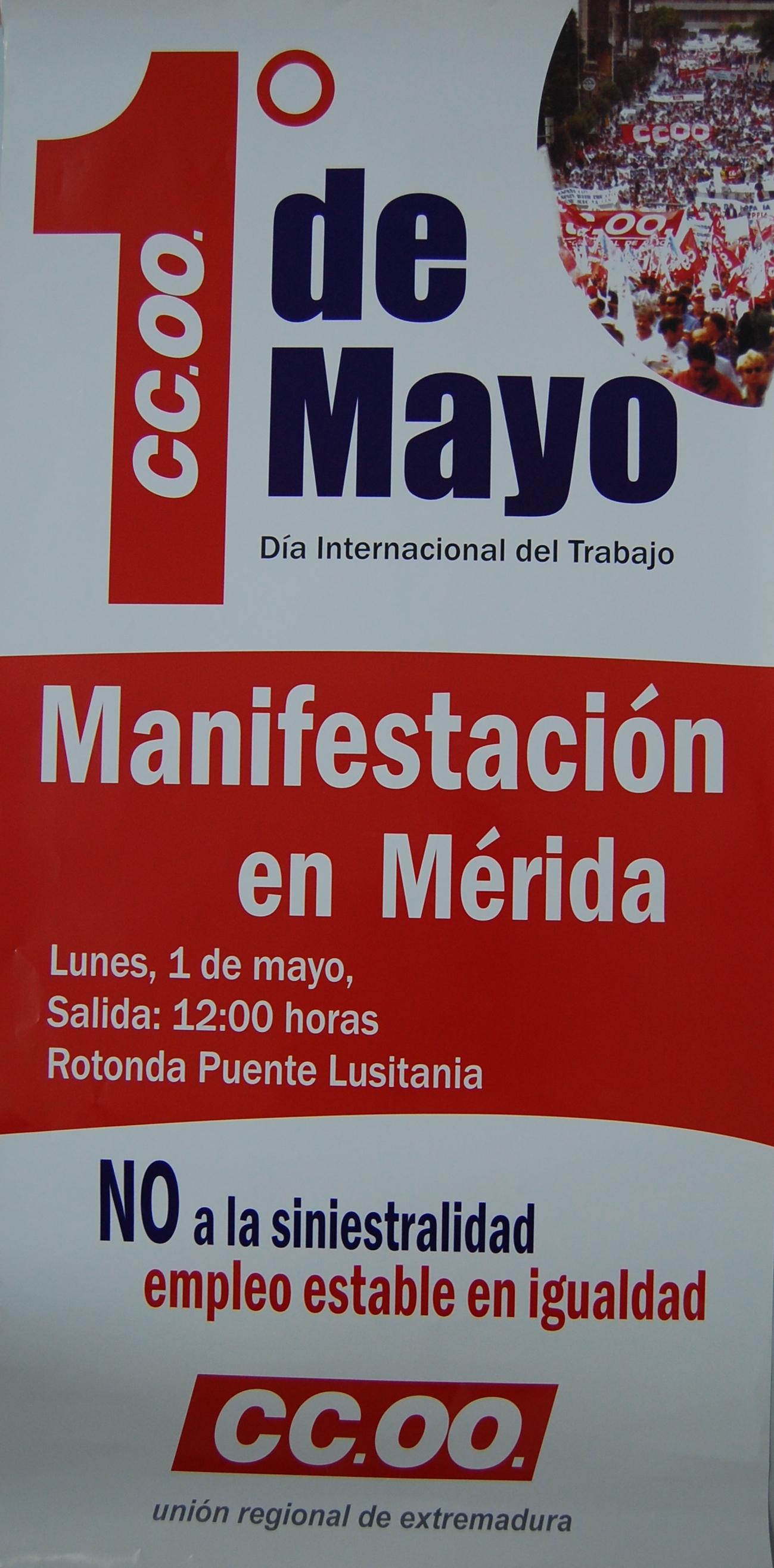 Descripción: Cartel con fondo blanco, en la parte de la derecha de arriba un sector de circulo con la foto de una manifestación, en la derecha un gran número 1 en rojo y de Mayo en azul, mas abajo una franja ancha en rojo y dentro el anuncio de la manifestación. El lema de la manifestación mas abajo con letras azules y rojas "NO a la siniestralidad empleo estable en igualdad"