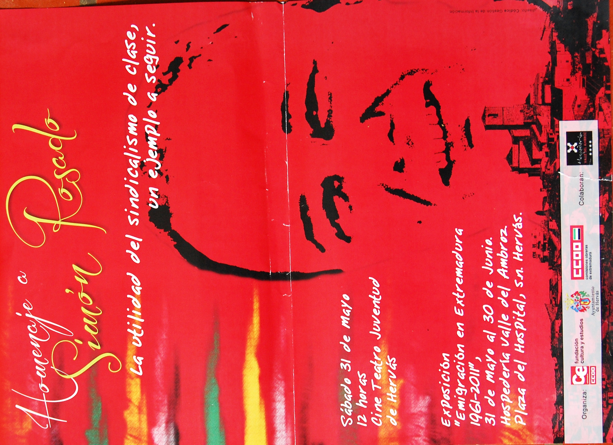 Descripción: Sobre fondo rojo leyenda en blanco y verde, a la derecha del cartel, la silueta de la cara de Simón Rosado en negro y en la parte inferior la silueta del pueblo de Hervás.