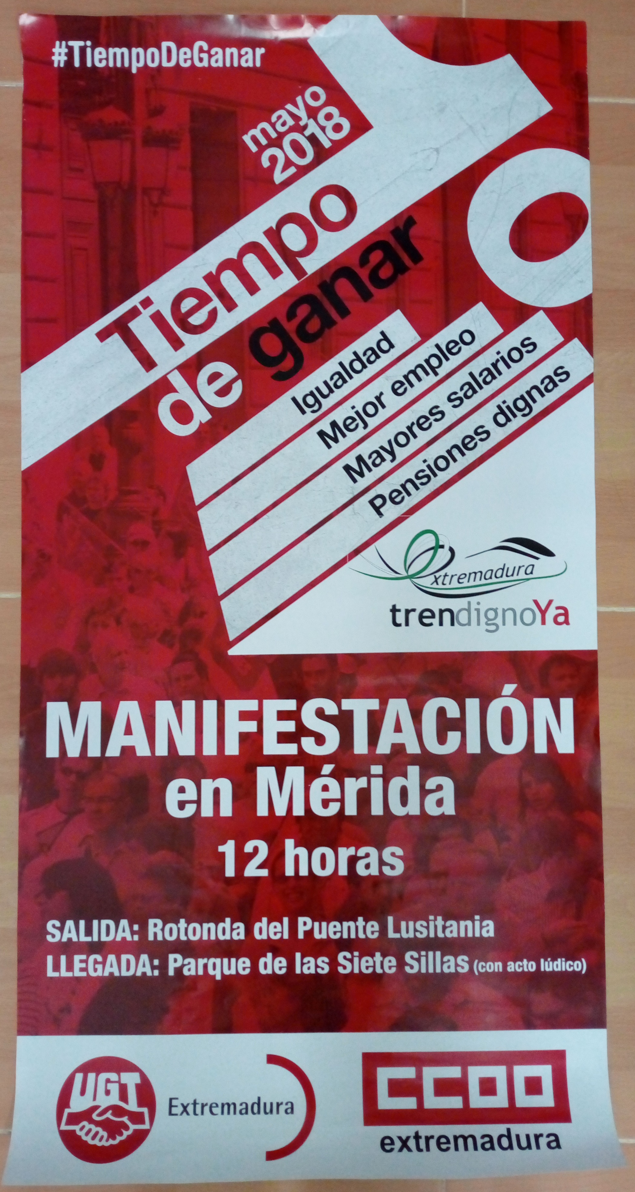 Descripción: El fondo es rojo con personas en una manifestación. El resto del cartel contiene la leyenda con el lema: "Tiempo de ganar: igualdad, mejor empleo, mayores salarios, pensiones dignas, tren digno ya".