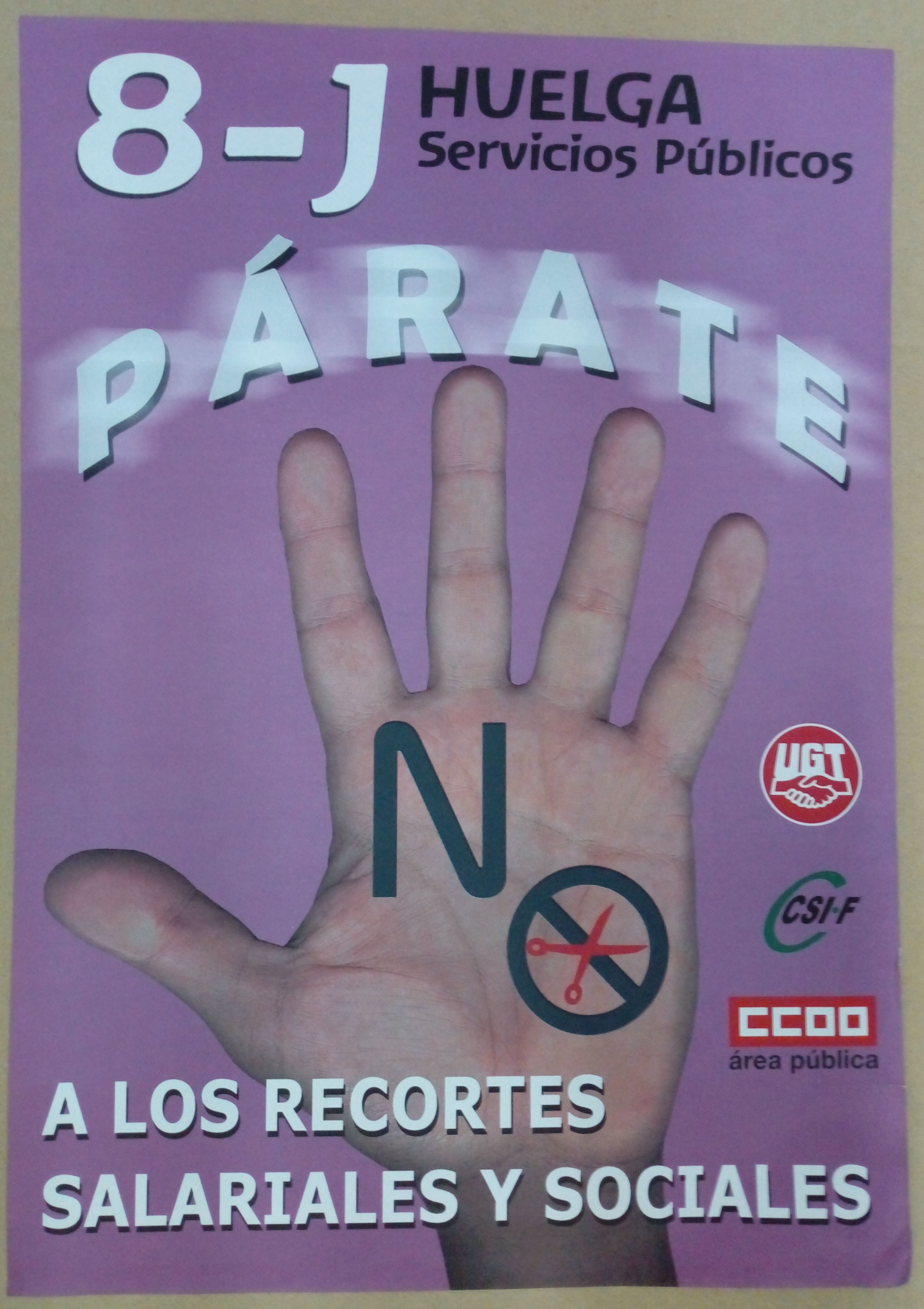 Descripción: El fondo es lila. En la parte superior, a la izquierda y con letras blancas pone 8-J PÁRATE y en la parte derecha se anuncia la huelga en letras negras. En el centro la palma de la mano en la que pone "NO" y en la parte inferior continúa la leyenda "A los recortes salariales y sociales".