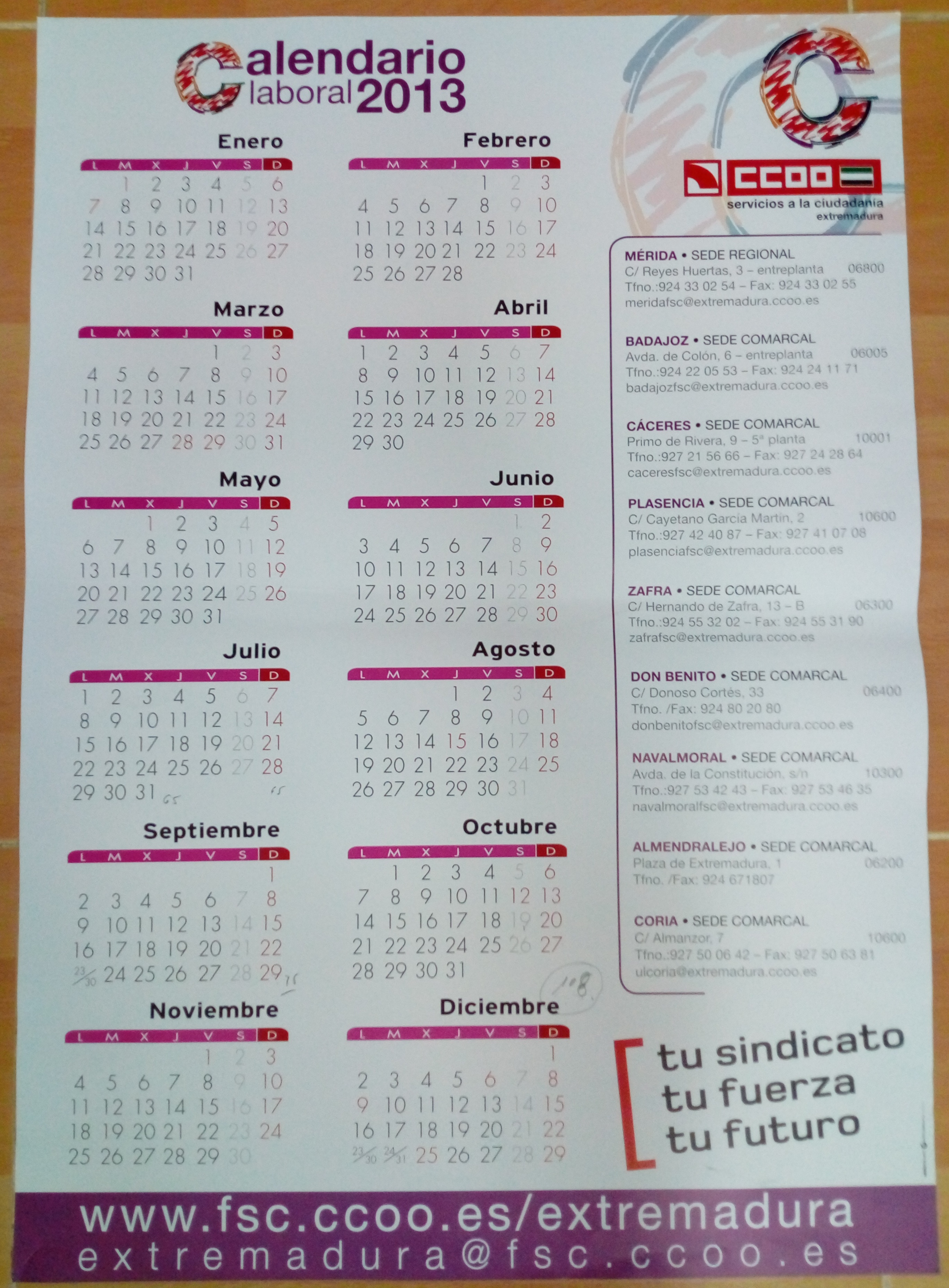 Descripción: Fondo blanco, con los meses del año en la parte izquierda y en la parte derecha la dirección de las distintas localidades de Extremadura donde tiene sede Comisiones Obreras. Lema en la parte inferior derecha: "tu sindicato" "tu fuerza" "tu futuro"