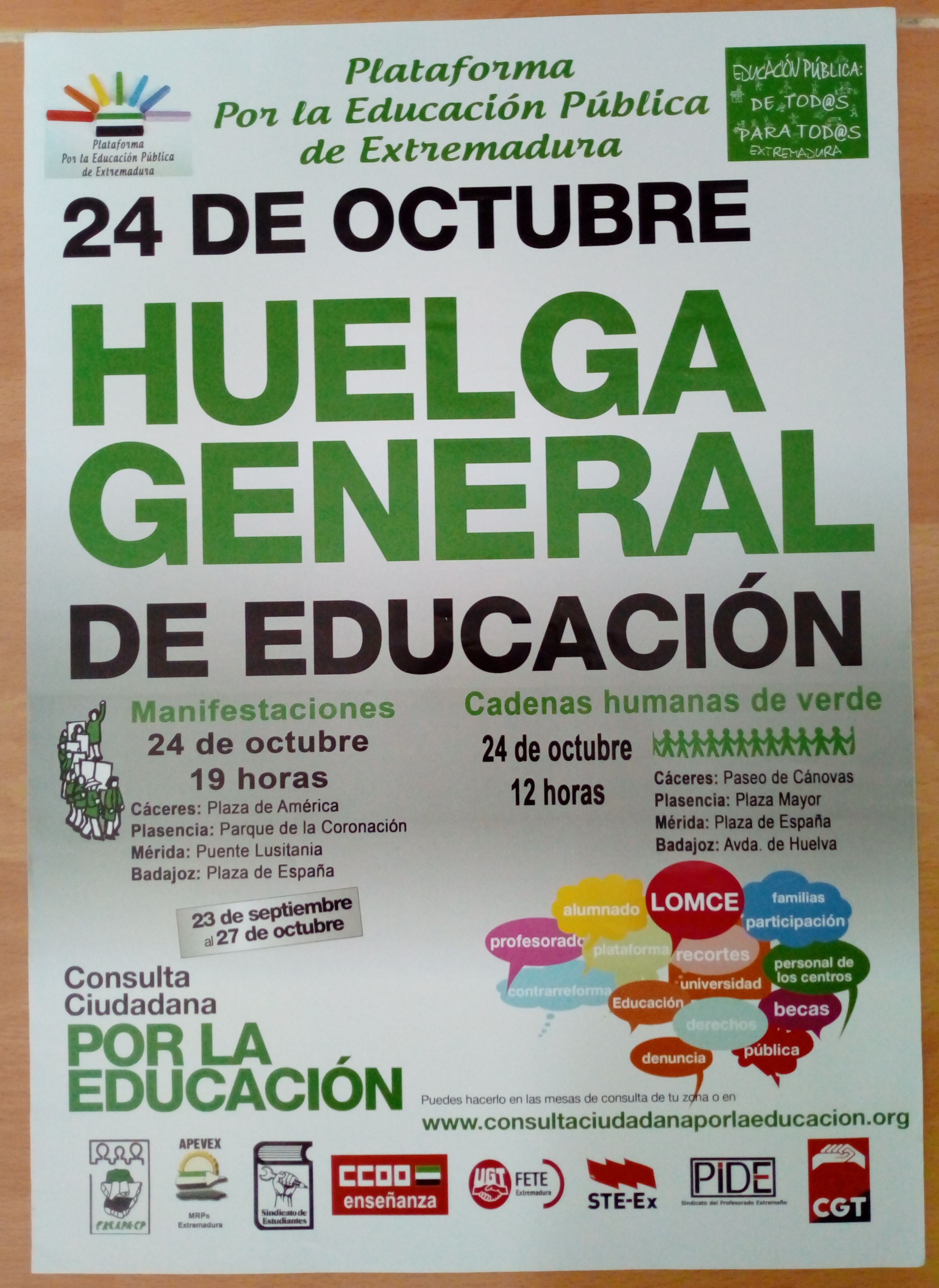 Descripción: En la parte superior izquierda el símbolo de la Plataforma Por la Educación Pública de Extremadura, en la esquina superior derecha el símbolo de Educación Pública. Huelga general en letras grandes en color verde y 24 de octubre y De educación en letras grandes negras. En el resto del cartel leyenda y donde aparece la dirección web de consulta ciudadana por la educación hay bocadillos de comic de colores con palabras como: LOMCE, profesorado, alumnado, universidad, becas, denuncia, derechos, etc.
