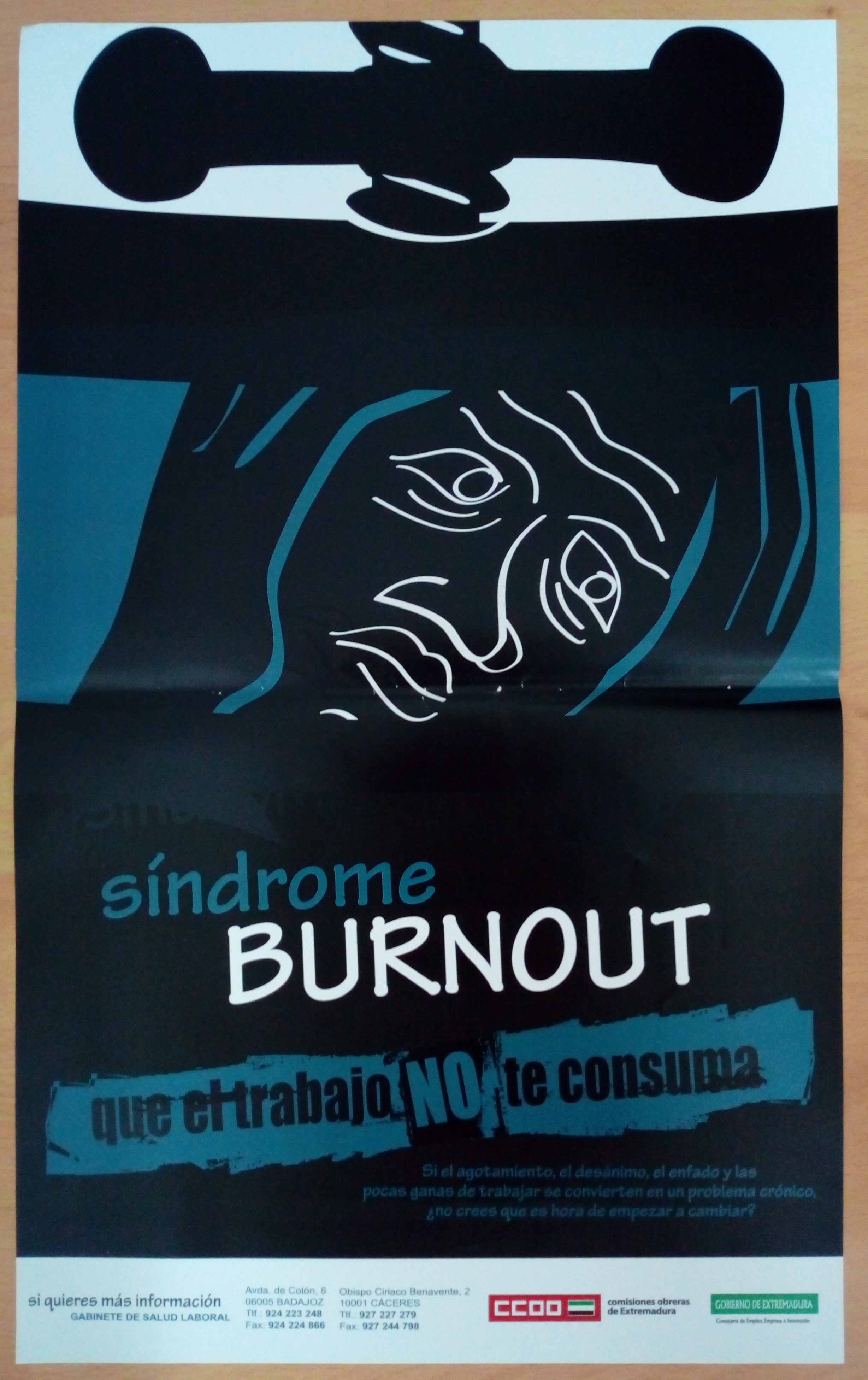 Descripción: Es una silueta en negro y blanco en las manos en la cabeza, debajo el título y la frase: Si el agotamiento, el desánimo, el enfado y las pocas ganas de trabajar se convierten en un problema crónico, ¿no crees que es hora de empezar a cambiar?. En la parte inferior, en una franja blanca, leyenda.