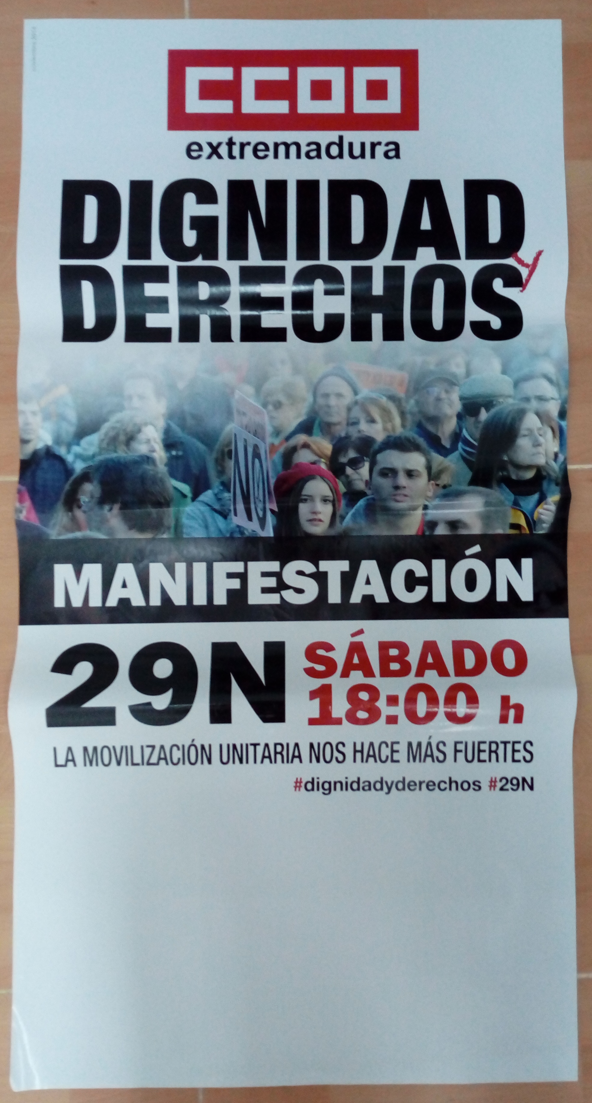 Descripción: En la parte superior el símbolo de CCOO Extremadura y Dignidad y derechos en letras grandes de color negro. El el centro la imagen de personas manifestándose y una franja negra transparente que pone manifestación en letras blancas. en la parte inferior leyenda:"29N. La movilización nos hace más fuertes"