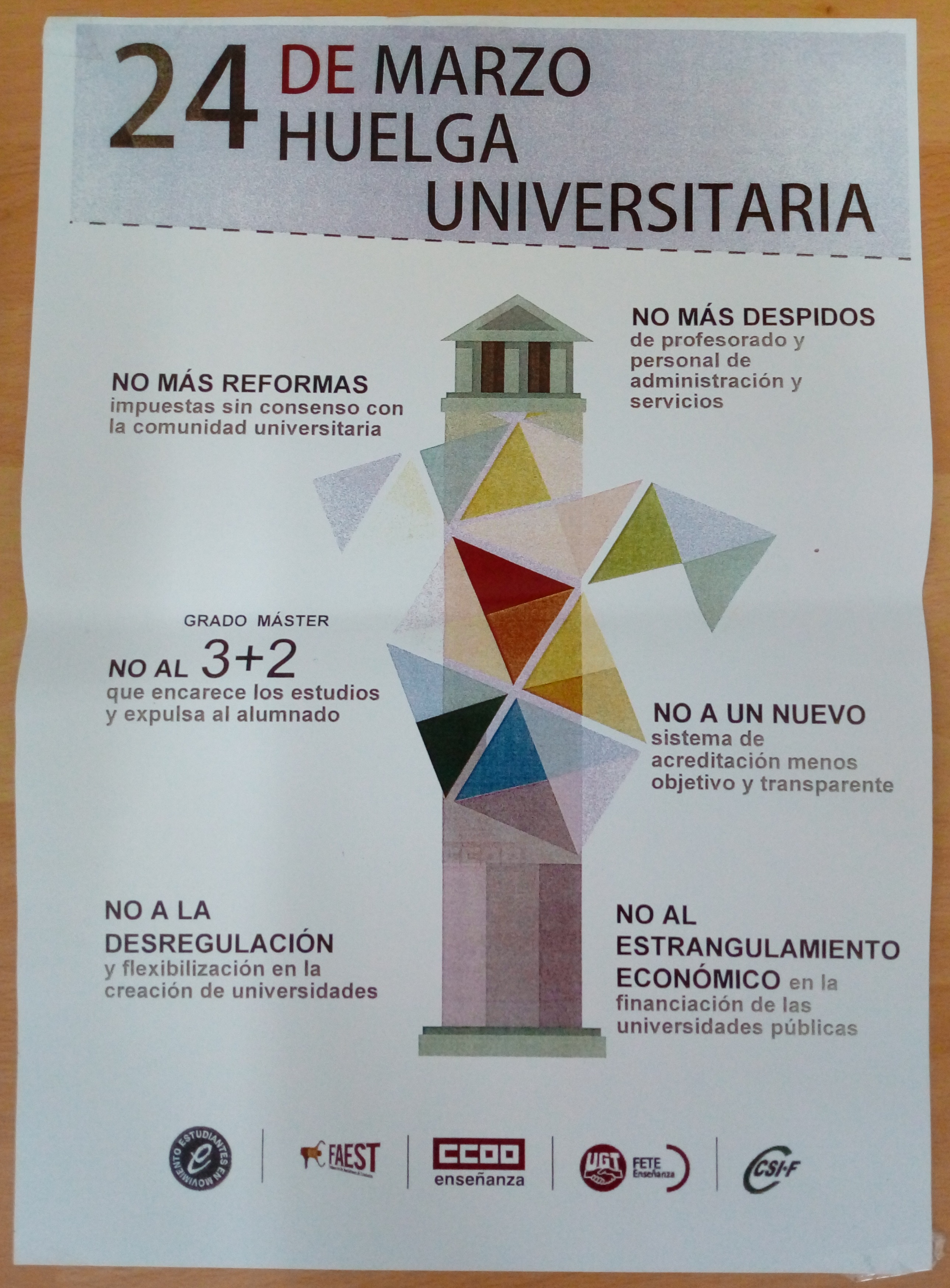 Descripción: El fondo es blanco, una franja lila con el título de la Huelga, en la parte derecha e izquierda del cartel está la leyenda y en el centro la imagen de una columna, con una figura geométrica con triángulos de diferentes colores y en la parte superior de la columna, el pórtico del Congreso de los diputados.