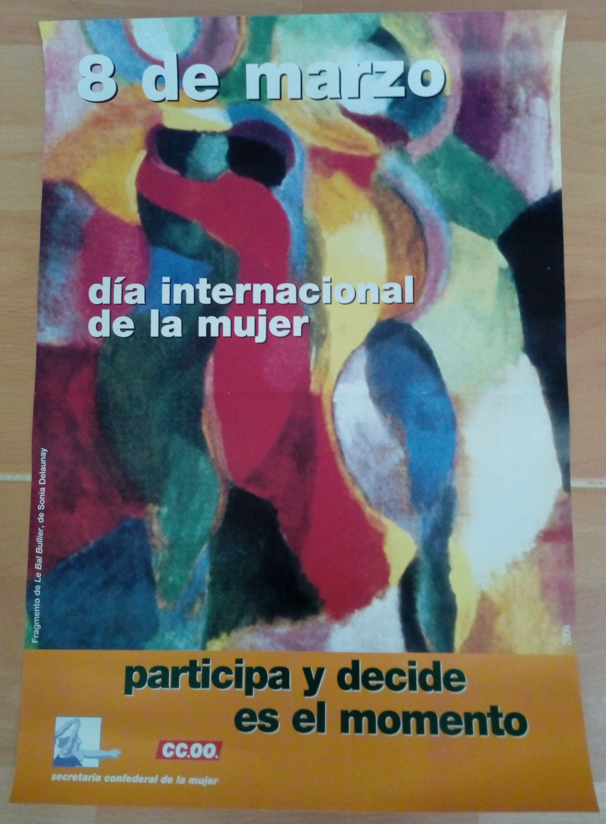 Descripción: El fondo es una imagen difuminada de un fragmento de la pintura Le Bal Bullier, de Sonia Delaunai. "8 de marzo Día Internacional de la Mujer" está en blanco. En la parte inferior hay una franja naranja con leyenda en color verde.