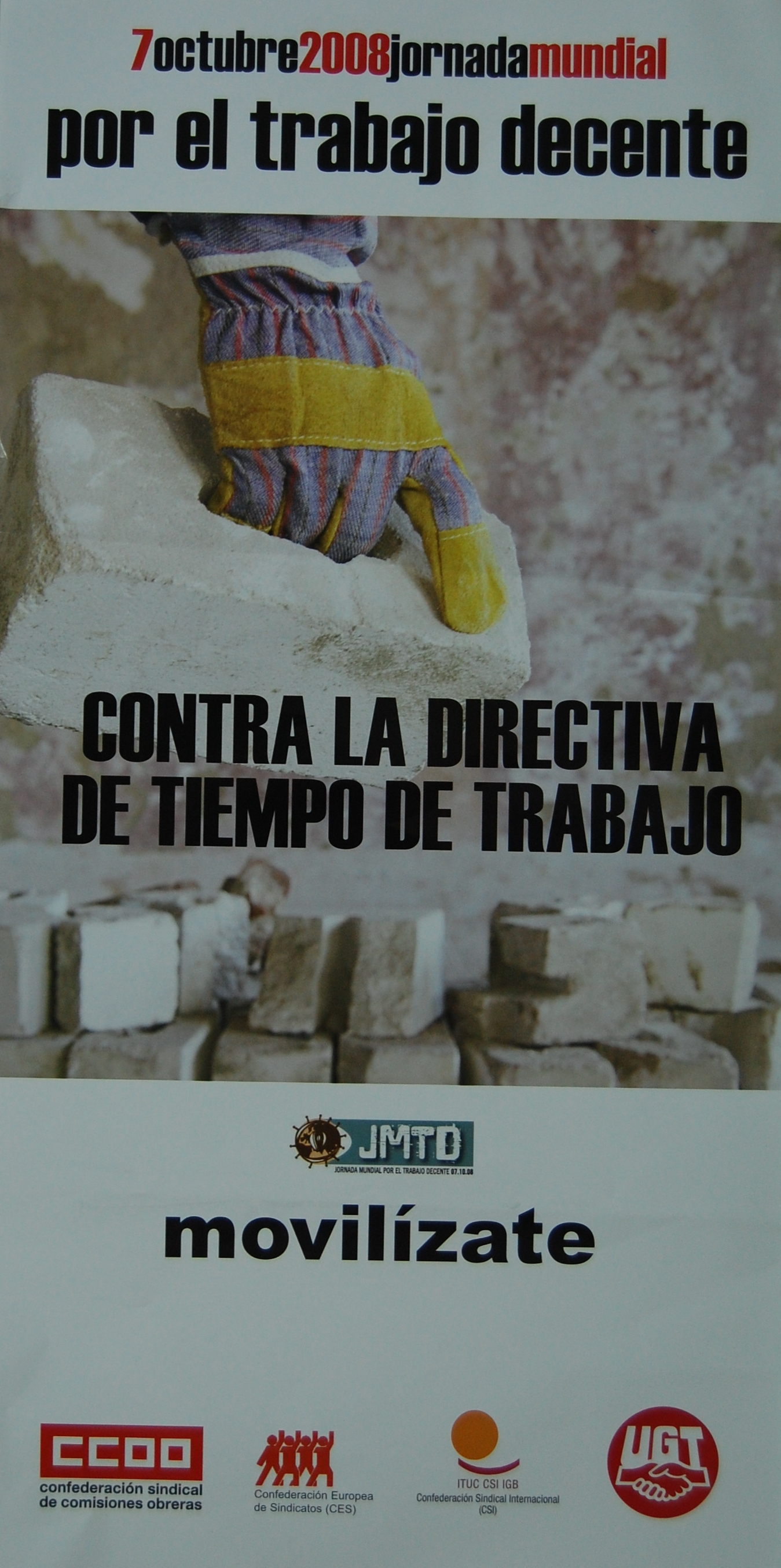 Descripción: Sobre fondo blanco, foto de una gran mano con guante encima de bloques de piedra y con el dedo pulgar apuntando al lema "Contra la directiva de tiempo de trabajo".