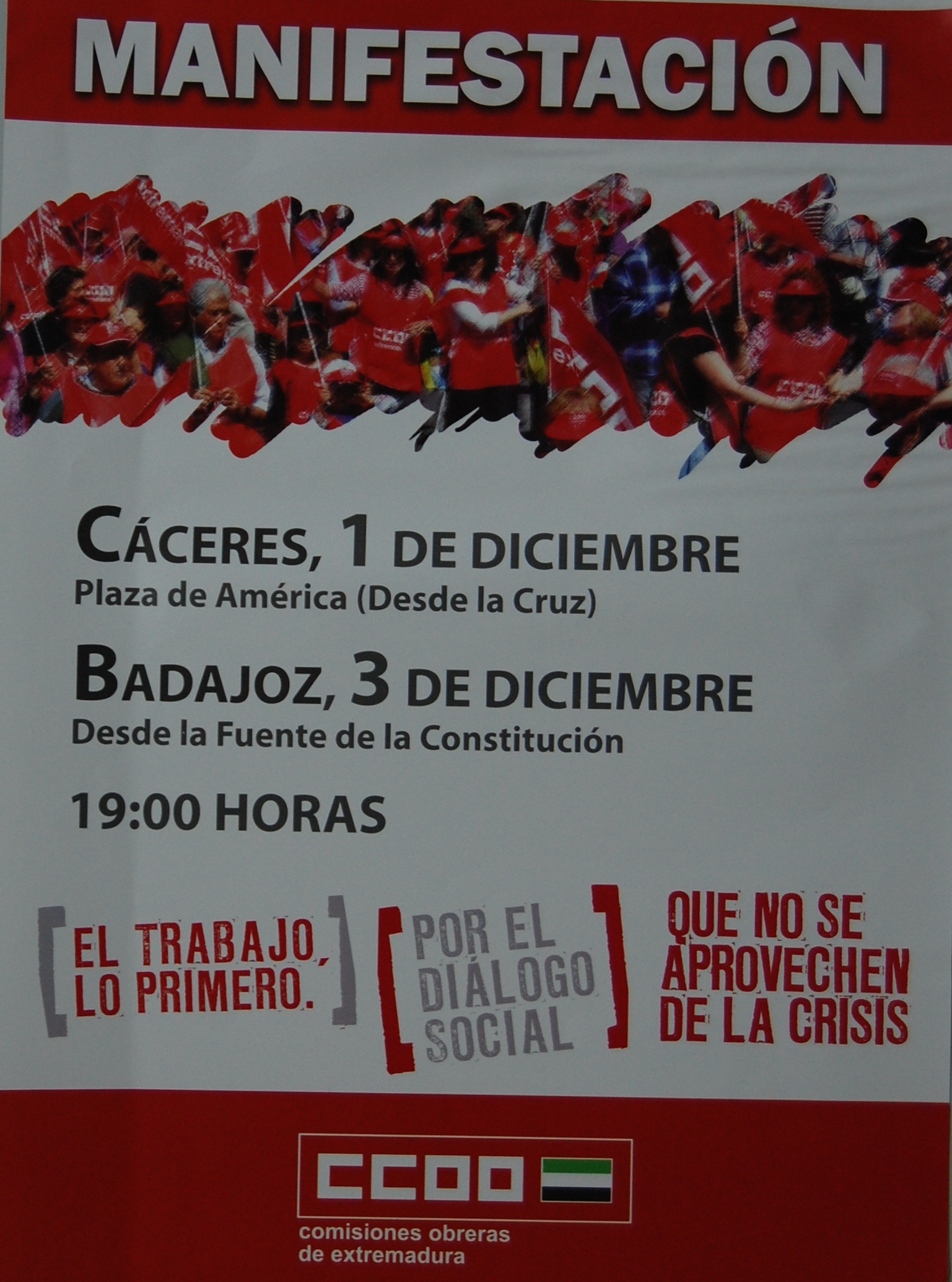 Descripción: Fondo del cartel blanco, en la parte superior una franja roja la palabra manifestación escrita en blanco, mas abajo una fotografía de manifestantes recortada y con barrido, mas abajo los lemas "el trabajo, lo primero" en rojo, "por el diálogo social" en gris y "que no se aprovechen de la crisis" en rojo al final una franja roja con el anagrama de CCOO Extremadura y la bandera extremeña.
